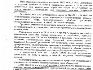 По словам Алексея Требунского, глава ЗАТО намерен заключить контракт на сбор и вывоз отходов с «Мехуборкой», поэтому и не способствует получению лицензии для МУП «ЖКХ». С приходом новой компании, отметил наш собеседник, стоимость услуги может увеличиться в несколько раз. Именно об этом на недавней встрече с жителями заявлял глава ЗАТО Светлый, подчеркнул муниципальный депутат.