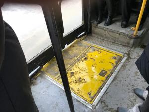 Поставили новость на сайте «Стройсар». На следующий день уже был ответ минтранса, и он - шокирующий. Выяснилось, что эта травмоопасная штуковина - специально откидывающаяся ступень для перевозки ИНВАЛИДОВ. Якобы некие службы зорко следят за тем, чтобы эти штуки исправно работали и откидывались. Поэтому закрывать их ковриками нельзя. А то, что из-за них еще кто-нибудь станет инвалидом - нормально: больше инвалидов - больше шансов испытать работу техники.