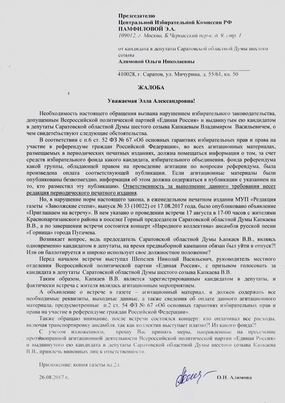 Первый секретарь Саратовского обкома КПРФ Ольга Алимова направила обращения в адрес председателя ЦИК Эллы Памфиловой и главы регионального избиркома Павла Точилкина. Лидер местных коммунистов просит проверить законность агитационной кампании спикера облдумы Владимира Капкаева, баллотирующегося в регпарламент в качестве «списочника» по Пугачевскому округу № 20.