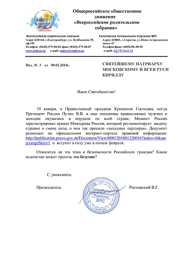Саратовский общественник и глава реготделения «Всероссийского родительского собрания» Владимир Росновский обратился к патриарху Московскому и всея Руси Кириллу. Поводом для этого стало подписание приказа Минздрава РФ о форме справок об изменении пола.