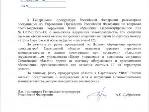 По словам Федоровой, только после того, как по поручению администрации главы государства Генпрокуратура начала проверять изложенные в обращении факты, «у областной прокуратуры «открылись глаза» на очевидное нарушение антимонопольного законодательства (чего она все лето упорно не замечала)». Получив «импульс» от руководства федерального ведомства, региональный надзорный орган незамедлительно уличил областные правительство и ГУ МЧС, ОГУ «ЦУКС СО», ПАО «Ростелеком», АО «ИскраУралТел» и ООО «Иутел» в нарушении закона о защите конкуренции направил в Саратовское УФАС представление о возбуждении административного дела.