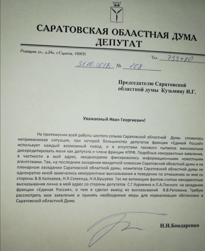 «В документе, который коммунист направил в связи с попытками привлечь его к ответственности за нелицеприятные высказывания в адрес оппонентов, указывается, что депутаты Сергей Курихин и Леонид Писной совершали аналогичные «грехи» на заседании единороссовской фракции. В качестве источника информации с закрытого мероприятия Бондаренко называл депутата от «Единой России» Вадима Рогожина.