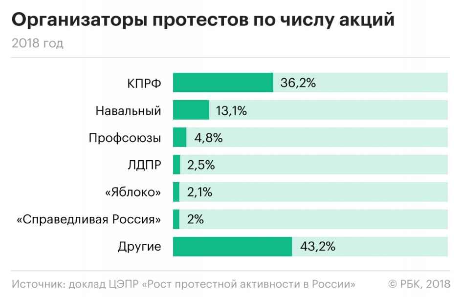 Почти половина (46,5 процента) протестных акций в 2018 году были связаны с пенсионной реформой. Наиболее активна в мобилизации граждан была КПРФ; на втором месте по числу проведенных мероприятий оказались сторонники Алексея Навального.