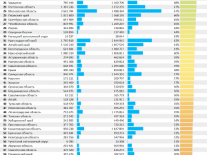 В числе отстающих оказались Ингушетия (33 процента), Костромская (32 процента) и Тамбовская области (28 процентов), которые заняли с 83-го по 85-е места соответственно.