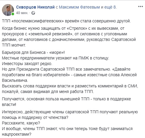 Интересно, действующие члены саратовской ТПП получают реальную помощь и поддержку от членства? Расскажите, какую? И вообще, члены ТПП знают, что они теперь тоже будут заниматься нацпроектами?» - задает риторический вопрос Скворцов.