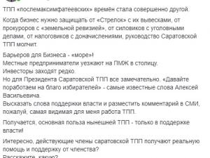 «ТПП «послемаксимфатеевских» времен стала совершенно другой. Когда бизнес нужно защищать от «Стрелок» с их вывесками, от прокуроров с «земельной ревизией», от силовиков с уголовными делами, от налоговиков с доначислениями, руководство Саратовской ТПП молчит.