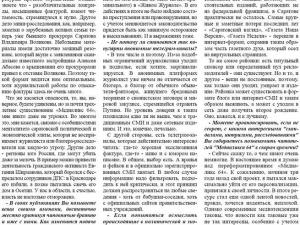 - Словосочетание «четвертая власть», определяющее сами средства массовой информации и их влияние на формирование общественного мнения, все чаще становится поводом для злых аналогий с другой древнейшей профессией. Журналистов называют сплетниками, априори продажными, людьми без морали и нравственных ориентиров. Как Вы считаете, это защитная реакция критикуемых и разоблачаемых или существуют реальные причины для подобных оценок?