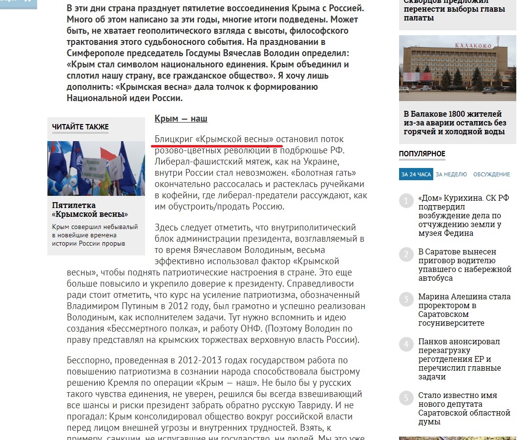 Так, в опубликованном позавчера «Четвертой властью» материале «Крымская весна»: скрепа Национальной идеи» Рогожин буквально сыплет метафорами, эпитетами и прочими текстуальными изысками. Вот лишь некоторые восторги, источаемые перекрасившимся белоленточником (дословные цитаты):