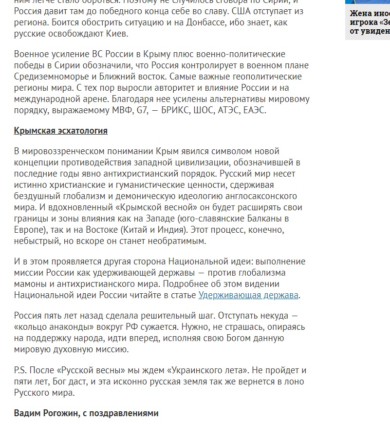 - Русский мир несет истинно христианские и гуманистические ценности, сдерживая бездушный глобализм и демоническую идеологию англосаксонского мира;