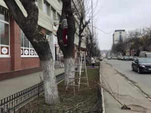 «Обрезка поручена ему администрацией вуза. Техзадание такое: «чтобы вниз ничего не свисало», обрезать нужно всю сторону Радищева вдоль стены СГАУ. Студент ведет обрезку впервые в жизни.