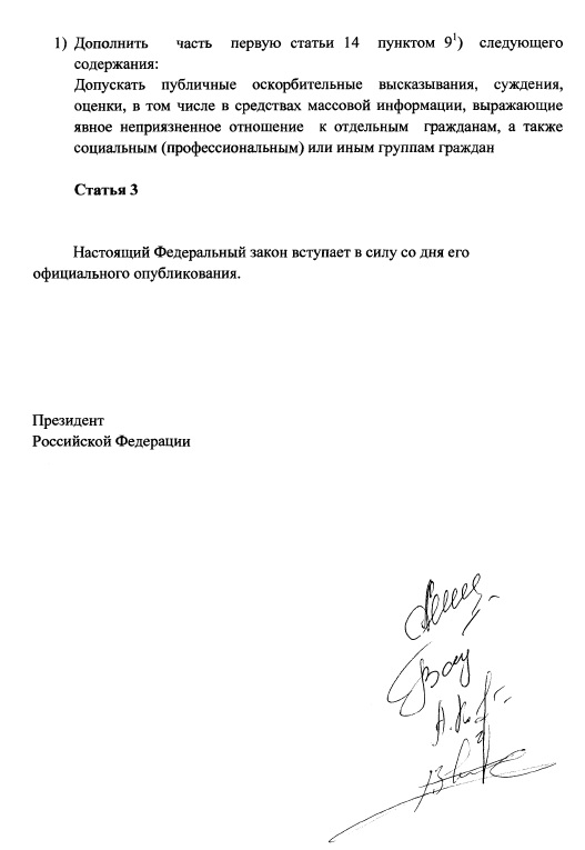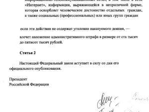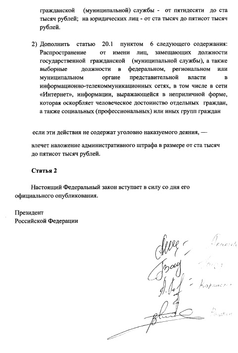 «Распространение от имени лиц, замещающих должности государственной гражданской (муниципальной службы), а также выборные должности в федеральном, региональном или муниципальном органе представительной власти в информационно-телекоммуникационных сетях, в том числе в сети «Интернет», информации, выражающейся в неприличной форме, которая оскорбляет человеческое достоинство отдельных граждан, а также социальных (профессиональных) или иных групп граждан, - если эти действия не содержат уголовно наказуемого деяния, - влечет наложение административного штрафа в размере от 100 тысяч до 500 тысяч рублей».