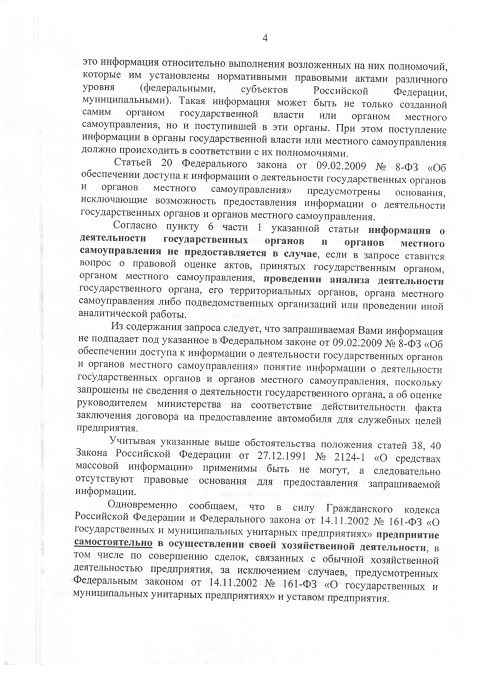 Кроме того, в нарушение указанных выше статей закона «О СМИ» в ответе министерства не была дана информация о заключении ГУП «Сартехинвентаризация» договора на предоставление автомобиля для служебных нужд с родственником/фирмой родственника директора ГУП «Сартехинвентаризация» в 2013-2017 годах. В обоснование отказа в предоставлении информации Олег Галкин сослался на положения статей 1, 2, 20 ФЗ «Об обеспечении доступа к информации о деятельности государственных органов и органов местного самоуправления». На основе пространного анализа правового документа чиновник сделал вывод о том, что данные о заключении договора на аренду авто являются сведениями об оценке руководством министерства действительности факта заключения договора.