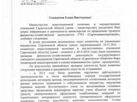 Данные о результатах проверочных мероприятий в период в с 2013 по 2016 год приведены были, однако министерство не сообщило о том, направлялись ли сведения по выявленным нарушениям финансово-хозяйственной деятельности в органы прокуратуры (за исключением последней ревизии, итоги которой были запрошены надзорным органом). Также не указаны сведения о мерах юридической ответственности в отношении руководства ГУП «Сартехинвентаризация» по выявленным нарушениям, в частности, взыскан ли с виновных ущерб, причиненный предприятию, и привлечены ли они к дисциплинарной, административной или уголовной ответственности.