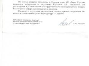 По итогам проверки прокурором города главе Саратова Валерию Сараеву направлена информация о допущенных Гнусиным нарушениях в установленном антикоррупционном законодательством порядке. В начале этой недели прокурору Саратова было отправлено письмо с просьбой предоставить сведения о результатах рассмотрения соответствующей информации. И тут Гнусин решил уволиться по состоянию здоровья. Легко захотел отделаться!