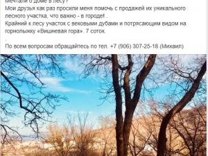«Мои друзья как раз просили меня помочь с продажей их уникального лесного участка, что важно - в городе! Крайний к лесу участок с вековыми дубами и потрясающим видом на горнолыжку «Вишневая гора». 7 соток», - отметил Максюта.