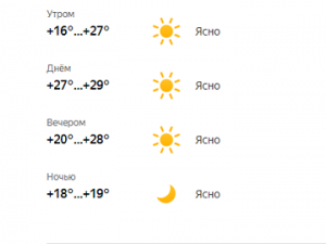 Сайт «Яндекс. Погода» прогнозирует в Саратове солнечный день и температуру +27…+29 градусов; ночью +18…+19 градусов. Ветер юго-западный 4-5 м/с.