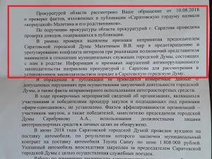 Прокурорская проверка подтвердила сведения о нарушении антикоррупционного законодательства председателем Саратовской городской думы Виктором Малетиным. Об этом говорится в официальном ответе надзорного органа региона на обращение ЦЖР «Медиаликс 64».