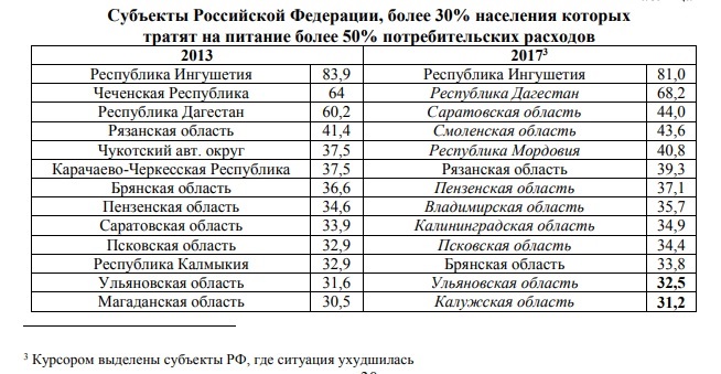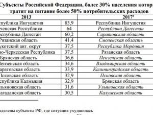 В 2017 году по этому показателю наш регион вышел на 3-е место, уступив Дагестану и Ингушетии, где на питание уходит свыше 50 процентов расходов у 68,2 процента и 81 процента населения соответственно.