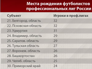 Лидером стала Москва, где родились 198 игроков профессиональных лиг нашей страны. Второе место занял Краснодарский край (109), а третье - Санкт-Петербург (95). В первую десятку также вошли Московская, Ростовская, Самарская области, Северная Осетия, Татарстан, Алтайский край и Волгоградская область.