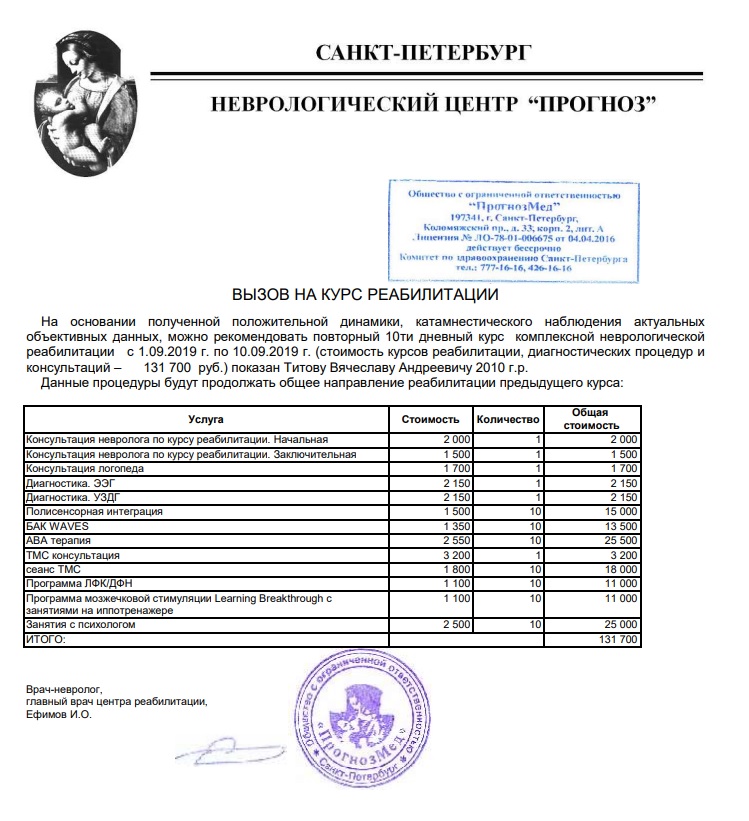 Напомним, после перенесенного в 2,5 месяца заболевания врачи поставили ему диагноз «менингоэнцефалит неясной этиологии» - оказалось, что у мальчика поражены обе височные доли головного мозга. Весь комплекс необходимых услуг маленькому саратовцу может предоставить неврологический центр «Прогноз», находящийся в Санкт-Петербурге. Стоимость реабилитации в этом учреждении составляет 131 тысячу 700 рублей (без учета проезда и проживания; с учетом дорожных расходов - 143 тысячи рублей). В курс лечения входят транскраниальная магнитная стимуляция, полисенсорная интеграция, АВА терапия и ряд других процедур, включая занятия с психологом (см. фото).