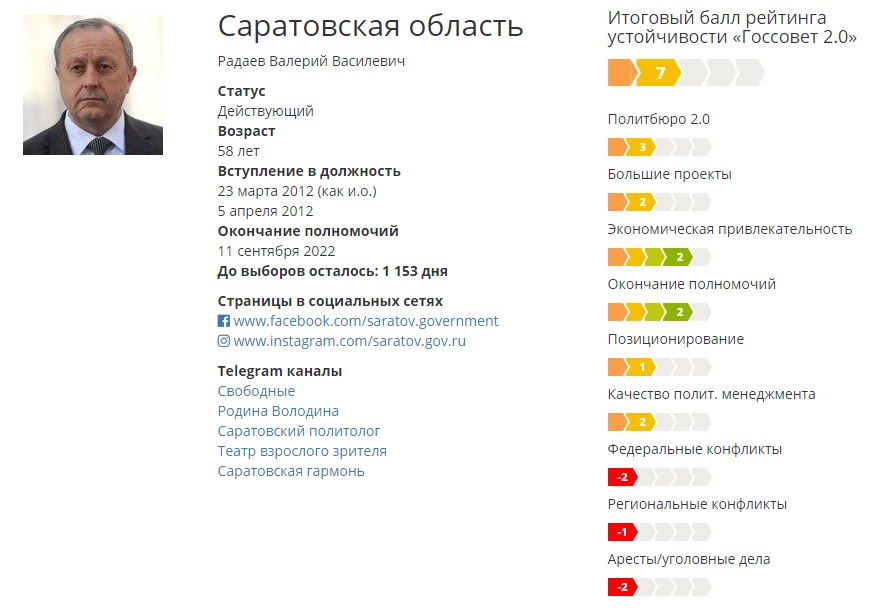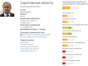 По сравнению с предыдущим рейтингом (он публиковался в сентябре прошлого года) показатели Валерия Радаева вновь ухудшились. Если в позапрошлом исследовании эксперты насчитали ему 11 баллов («желтая зона»), а в прошлом - всего 8 баллов («красная зона»), то в четвертом губернаторском докладе «Госсовет 2.0» он потерял еще 1 балл. Таким образом, Радаев набрал всего 7 баллов, продемонстрировав худший результат среди коллег из Приволжского федерального округа и один из самых плохих по стране (столько же в активе главы Еврейской АО Александра Левинталя; хуже дела обстоят только у 5-балльного руководителя Карачаево-Черкесии Рашида Темрезова).