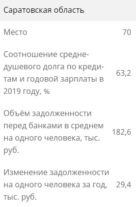 Саратовская область за год поднялась с 71-го места на 70-е. Однако уровень закредитованности жителей региона вырос с 59,3 до 63,2 процента, так как среднедушевой объем кредита экономически активного саратовца увеличился со 163,1 тысячи рублей до 182,6 тысячи рублей.