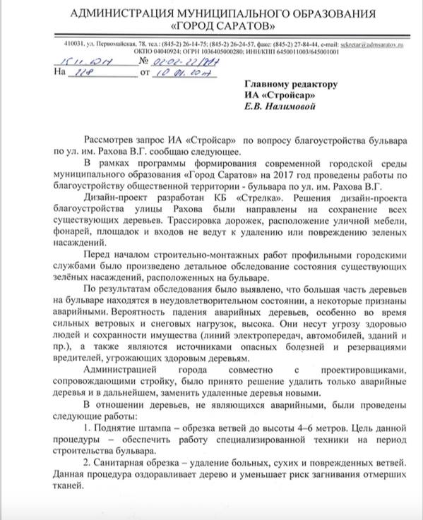 В первом ответе администрация города заявила, что деревья были уничтожены, потому что «по результатам обследования» было выявлено, что «БОЛЬШАЯ ЧАСТЬ деревьев на бульваре находится в неудовлетворительном состоянии, а некоторые признаны аварийными… Они несут угрозу здоровью людей.., а также являются резервациями вредителей, угрожающих здоровым деревьям».