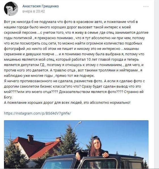 «Вот уж никогда б не подумала что фото в красивом авто, и пожелание чтоб в нашем городе было много хороших дорог вызовет такой интерес к моей скромной персоне....с учетом того, что я живу в семье, где отец занимается долгие годы политикой, я прекрасно понимаю, что я тут абсолютно ни при чем, потому что если посмотреть соц сети, то можно найти огромное количество подобных фотографий, но никто об этом не пишет и никому это не интересно ...машины серьезнее и девушки поярче... и я понимаю почему была выбрана я, потому что мишенью является мой отец, который работал 10 лет главой города и теперь является депутатом ГД, поэтому я отношусь к этому с пониманием, для чего, и против кого это делается. А травлю отца, вот такими троллями и хейтерами, я наблюдаю уже многие годы, прямо тот же подчерк.