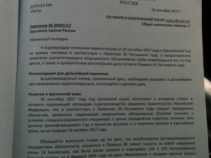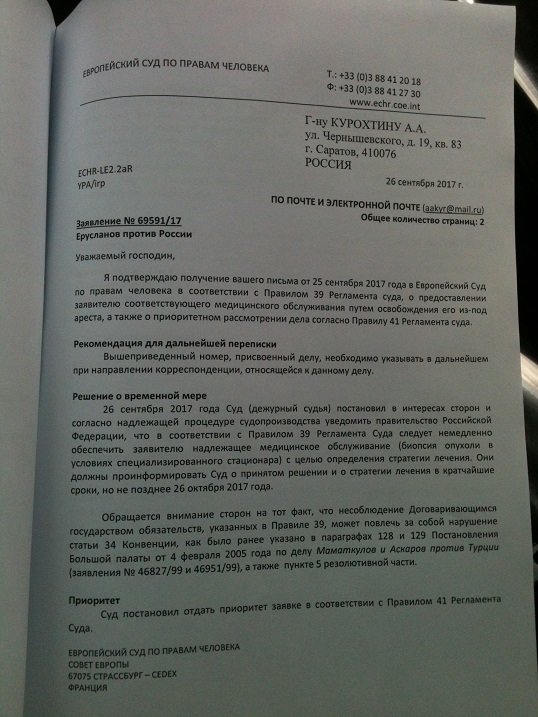 В полученном защитником ответе ЕСПЧ говорится, что его обращение было рассмотрено дежурным судьей, который постановил «уведомить правительство РФ, что в соответствии с Правилом 39 Регламента Суда заявителю следует немедленно обеспечить надлежащее медицинское обслуживание (биопсия опухоли в условиях специализированного стационара) с целью определения стратегии лечения. О принятом российской стороной решении ЕСПЧ должен быть проинформирован не позднее 26 октября текущего года.
