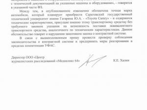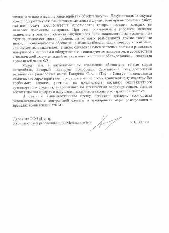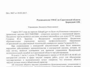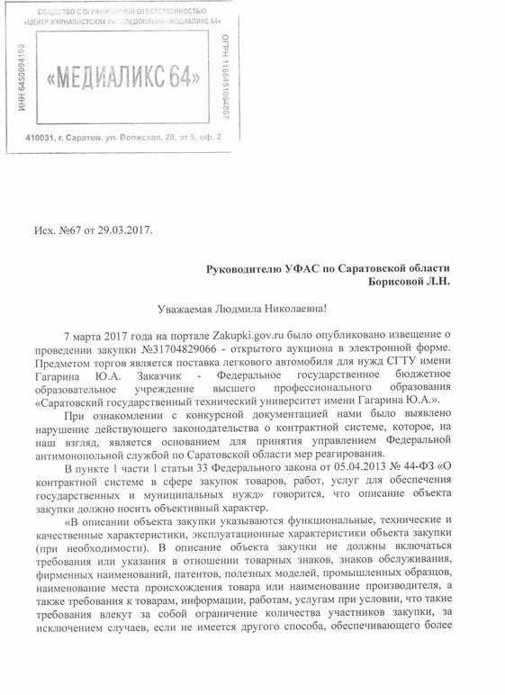 ЦЖР «Медиаликс 64» выявил нарушение при проведении торгов на поставку дорогой иномарки для нужд Саратовского государственного технического университета. Соответствующую жалобу на несоблюдение заказчиком ФЗ о контрактной системе наше издание направило сегодня, 29 марта, руководителю регионального УФАС Людмиле Борисовой.