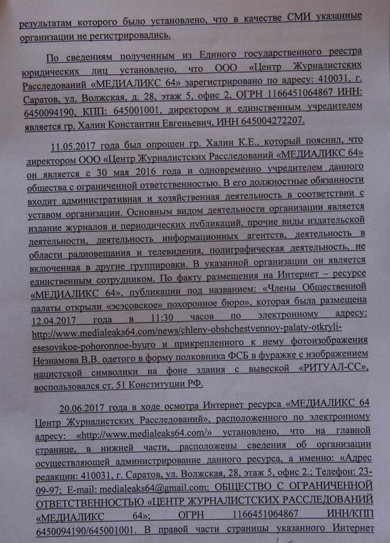 Чтобы наказание было более ощутимым в финансовом смысле, Центр «Э» решил привлечь к ответственности именно организацию, так как для физических и дожностных лиц штрафы по этой статье намного меньше. При этом полицейских не смутило то обстоятельство, что в материалах дела в качестве интернет-страницы Центра журналистских расследований «Медиаликс 64» фигурирует интернет-адрес www.medialeaks64.com, который юридически никакого отношения к организации не имеет (на ЦЖР зарегистрирован другой домен - www.medialeaks64.ru).
