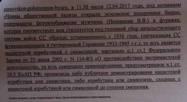 Заметку сопровождал фотоколлаж, изображающий Незнамова в форме полковника ФСБ и фуражке войск СС на фоне здания похоронного агентства. В написанном спустя некоторое время обращении в полицию член региональной ОП указал на наличие в фотоизображении нацистской символики, а также заявил, что материал оскорбляет его.