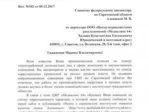 Сегодня, 5 декабря, ЦЖР «Медиаликс 64» направил обращение главному федеральному инспектору по Саратовской области Марине Алешиной. В нем наше издание просит предпринять меры по возврату земельного участка, который ранее являлся территорией областного института развития образования (Большая Горная, 1).
