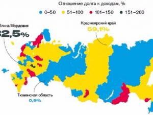 Самое тяжелое положение дел сложилось в Мордовии, где объем долгов на 82,5 процента больше поступлений в бюджет. Также сложная ситуация отмечается в Костромской и Смоленской областях, Карелии, Северной Осетии, Хакасии, Ингушетии, Астраханской области, Еврейской АО, Забайкальском крае и Марий Эл (заняли соответственно со 2-го по 11-е места). Чукотский АО и Псковская область перебрали по данному показателю всего 0,9 и 0,7 процента, заняв 13-ю и 14-ю строчки.