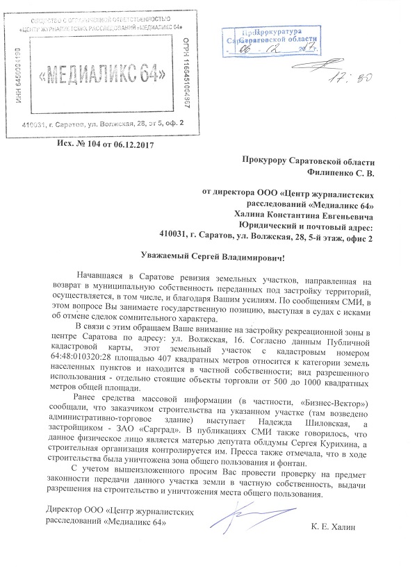 ЦЖР «Медиаликс 64» направил обращение прокурору Саратовской области Сергею Филипенко. В нем речь идет о продаже земельного участка на пересечении улиц Волжская и Комсомольская и строительстве на нем административно-торгового здания.