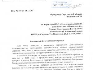 «Нам стало известно о серьезных нарушениях действующего законодательства, допущенных должностными лицами администрации Саратова. Речь идет о заключенных накануне договорах на обслуживание транспортных маршрутов на территории областного центра.
