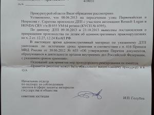 ЦЖР «Медиаликс 64» получил ответ на свое обращение к прокурору Саратовской области Сергею Филипенко. Оно касалось резонансного ДТП с участием иномарки, принадлежащей Елене Степановой (в замужестве Жаднова), дочери экс-главы регионального надзорного ведомства Владимира Степанова. Наше издание просило руководителя органа власти «проверить, насколько объективно и беспристрастно велось административное расследование» этой аварии.
