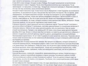 Как следует из обращения, с того времени коллектив оказался на улице, а руководство дома культуры создало новый хор ветеранов. Однако коллектив «Надежда» не прекратил выступать и обратился за поддержкой к местным депутатам, которые обязали директора ДК предоставить им места для репетиций и номера в концертных программах. Требование народных избранников директор учреждения проигнорировала и вообще запретила коллективу выступать, а замглавы администрации по социальным вопросам заявила, что городу не нужен второй хор ветеранов и начала прогонять их со всех мероприятий.