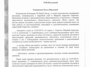Компания X5 Retail Group заявила о готовности высадить в Мирном переулке Саратова еловые саженцы-крупномеры, взамен уничтоженных деревьев. Об этом ритейлер сообщил депутату Госдумы Ольге Баталиной, отвечая на официальный парламентский запрос. В свою очередь народная избранница разместила письмо с ответом владельца «Пятерочки» в соцсети Facebook.