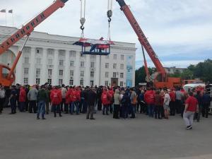 Как сообщают региональные СМИ, сегодня на переименованной площади местные коммунисты устроили акцию протеста. Утром они подогнали два крана «Ульяновец» и растянули транспаранты «Долой Морозова!» (губернатор Ульяновской области - прим. ред.) и «Слава Ленину!». Несколько активистов приковали себя цепями к строительной технике.