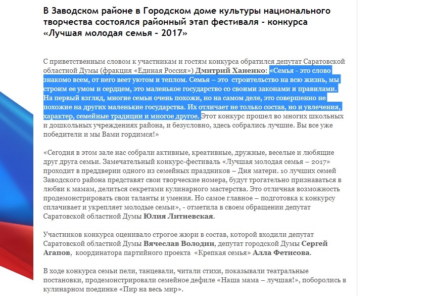 Депутаты Саратовской областной думы поздравили молодые семьи Заводского района заимствованными текстами. К таким выводам пришел ЦЖР «Медиаликс 64» по итогам анализа пресс-релиза, опубликованного на официальном сайте реготделения «Единой России».