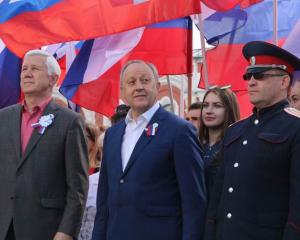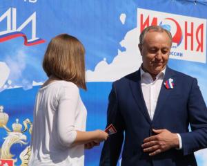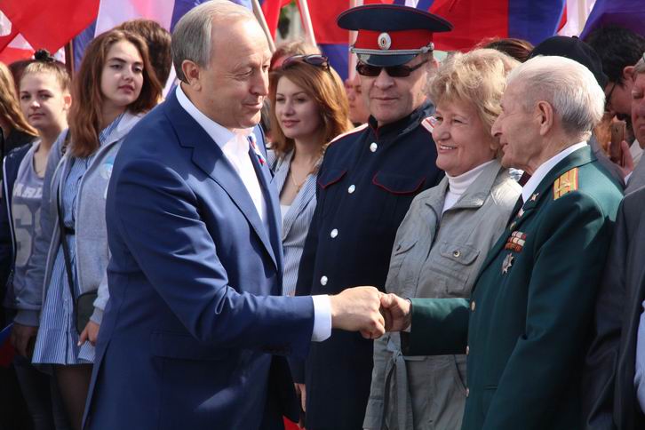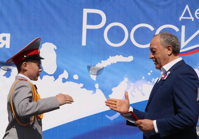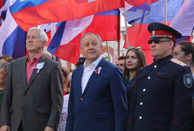 После выступления хора, исполнившего гимн России, на сцену поднялся врио губернатора Валерий Радаев, который зачитал короткую речь, прославляющую область и ее обитателей.